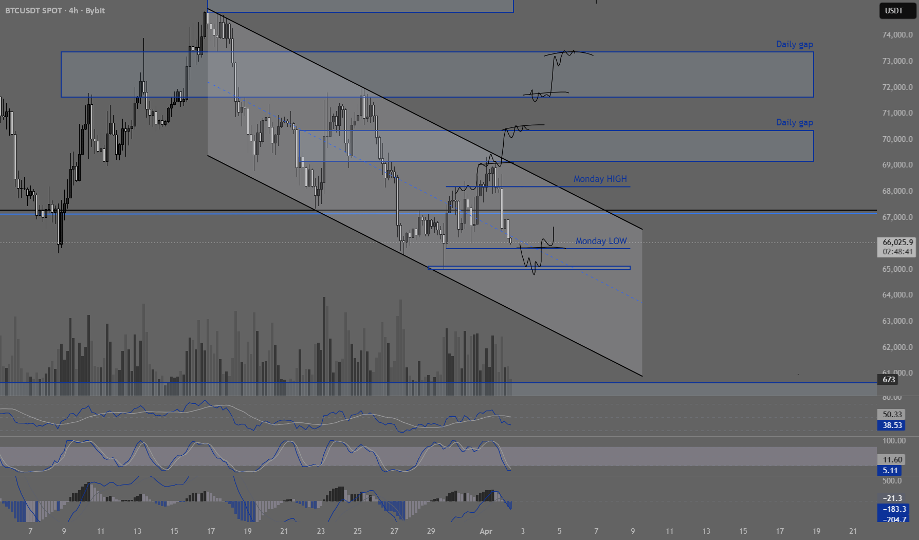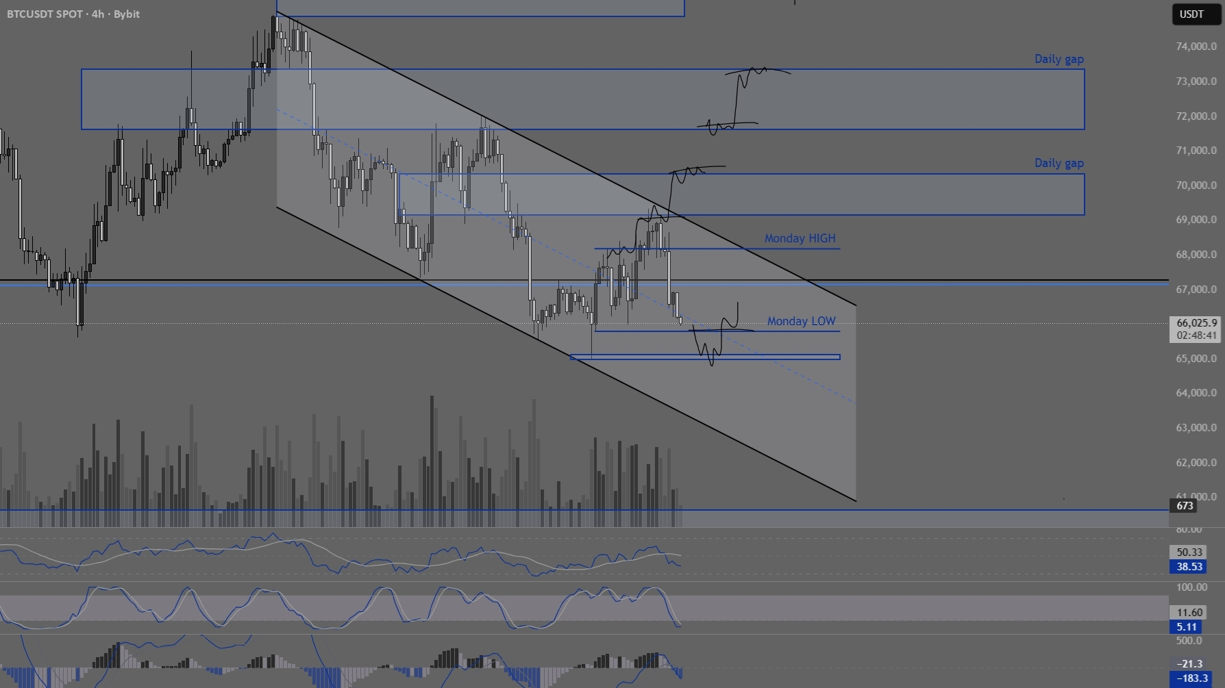Price is currently at 66,453, sitting just above Monday low and grinding toward the 65k liquidity zone.