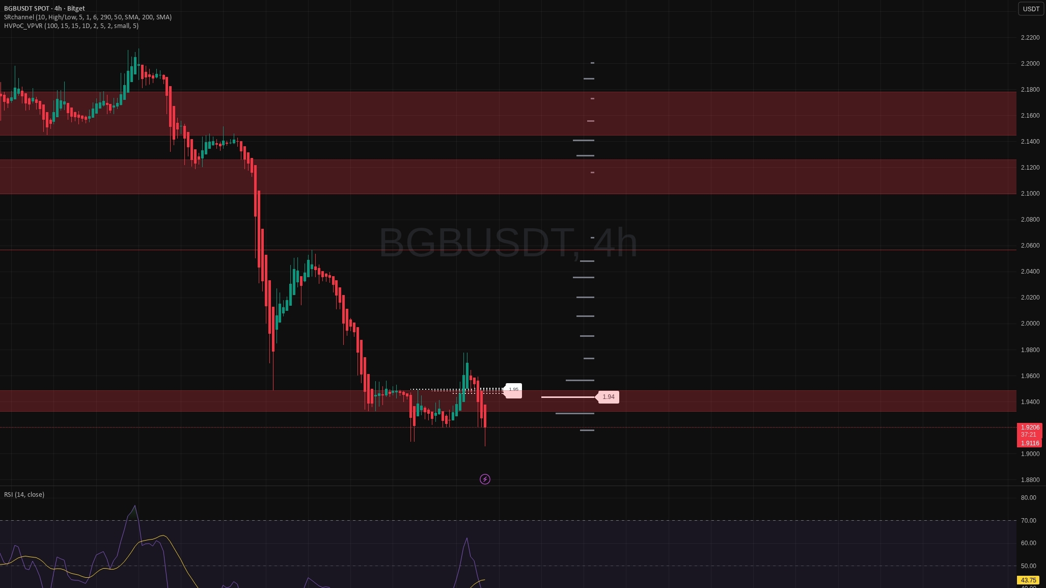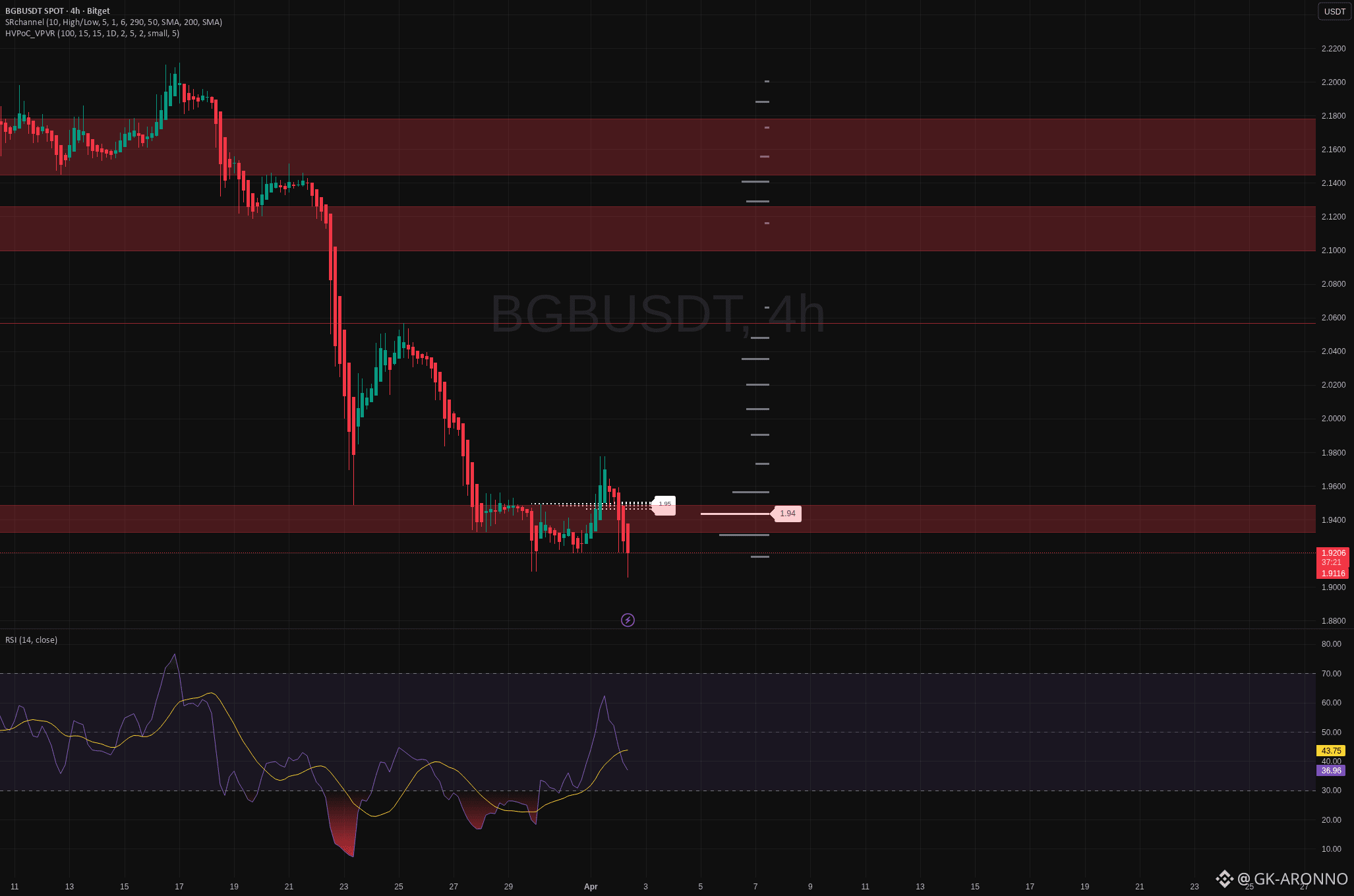 On the 4H chart price is stuck in that red demand zone around 1.90 with a clear series of lower highs after the last spike. RSI is hovering near oversold but with no strong bullish divergence, so I still lean short term bearish, expecting a sweep of liquidity below the current lows before any serious recovery. If we get another fast wick down with higher 4H RSI and strong buyback, that’s the signal that sellers are getting tired.