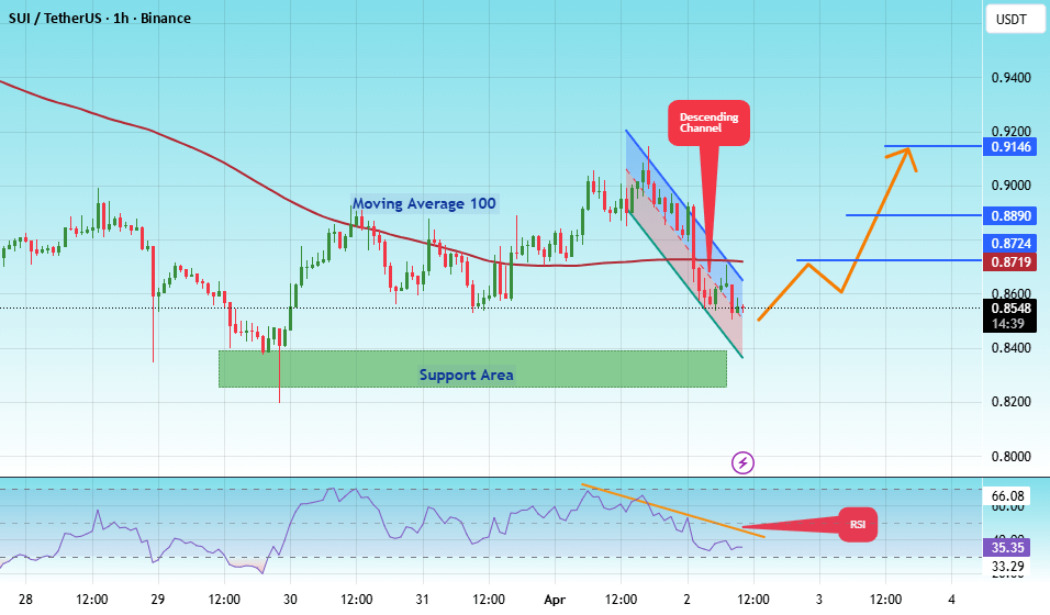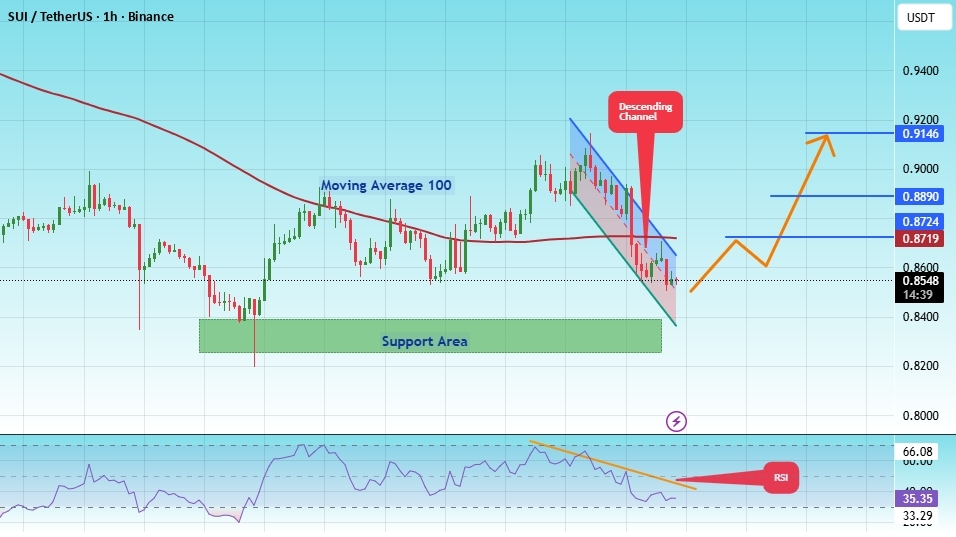 The price is moving within a descending channel on the hourly timeframe. It has reached the lower boundary and is trending towards a bounce. A retest of this boundary is expected.