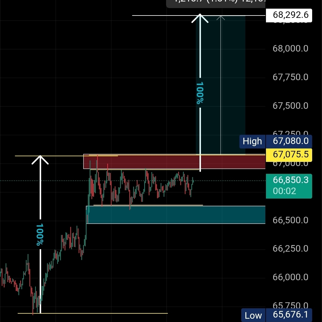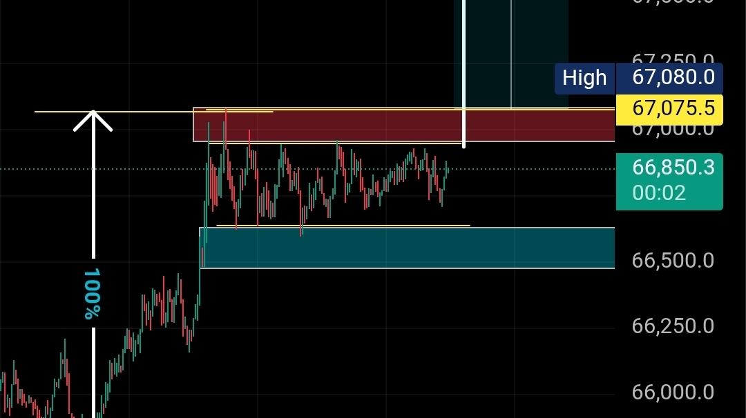 * 67,288 – 67,130: Zonă de Oferte + Gap de Valoare Corectă (FVG). Aceasta este o zonă principală de "vânzare" dacă prețul se retrage.
