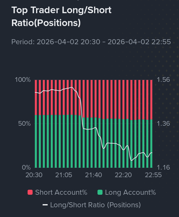 La începutul cronologiei, traderii de top erau relativ echilibrați. Pozițiile lungi erau ușor dominante, iar raportul era stabil. Asta este un mediu neutru până la ușor bullish.
