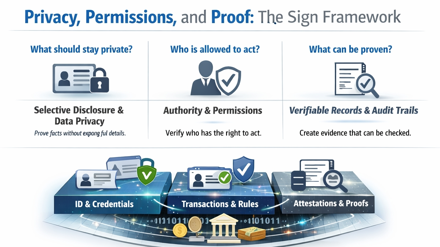 I find it helpful to start with what I thought this kind of system was supposed to do. I used to think privacy and accountability pulled in opposite directions and that any framework promising both was probably hiding the tradeoff somewhere in the fine print. The more I look at the Sign framework the more I think its real point is simpler than that because it tries to separate three questions that often get mashed together: what should stay private what authority someone actually has and what can later be proven about what happened.