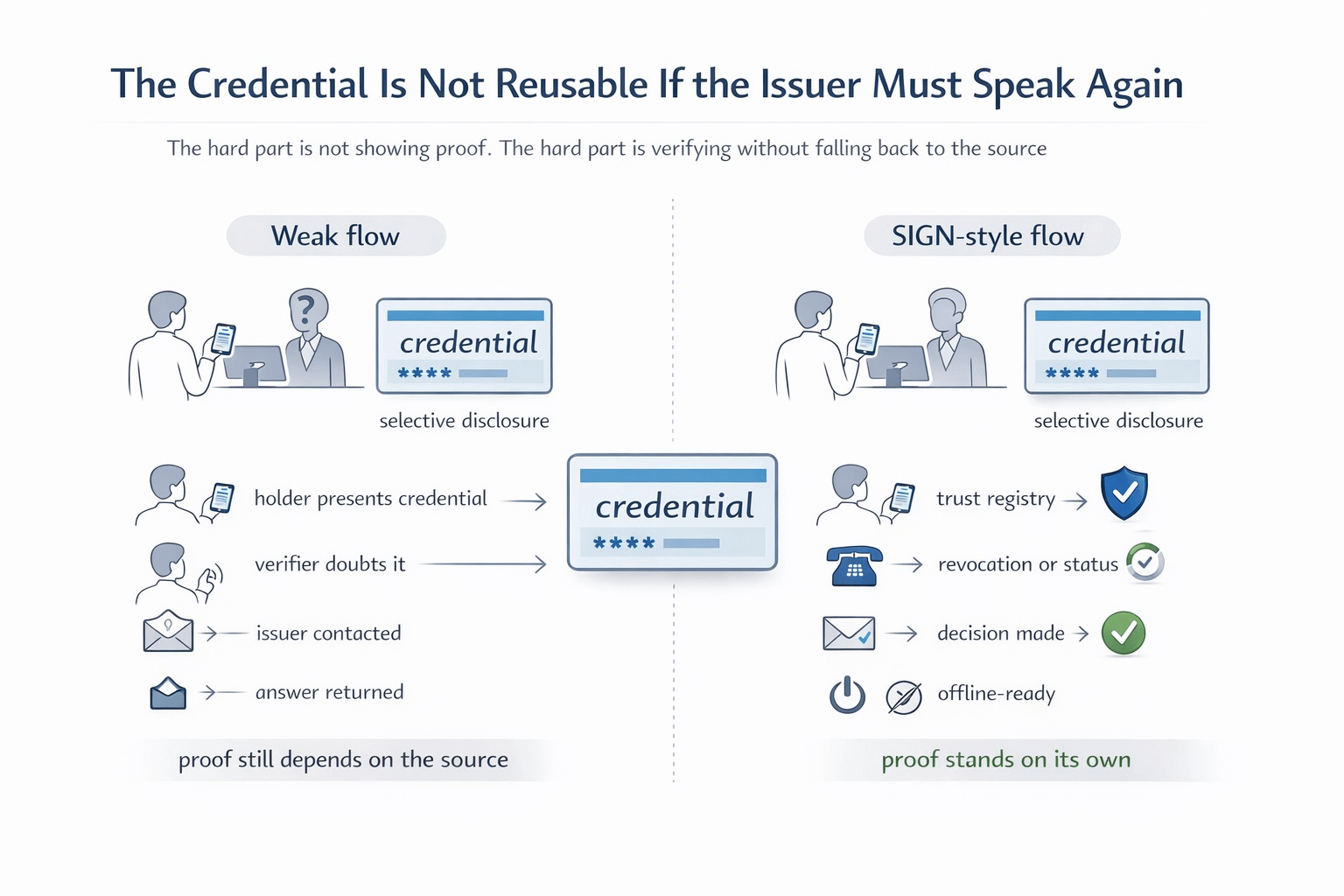 The damage is bigger than delay. Verifiers get trained to trust the live response more than the signed proof in front of them. Holders learn that bringing the credential still isn’t enough. And little by little, the whole flow slides back into central lookup behavior while everyone keeps talking as if the proof stands on its own.