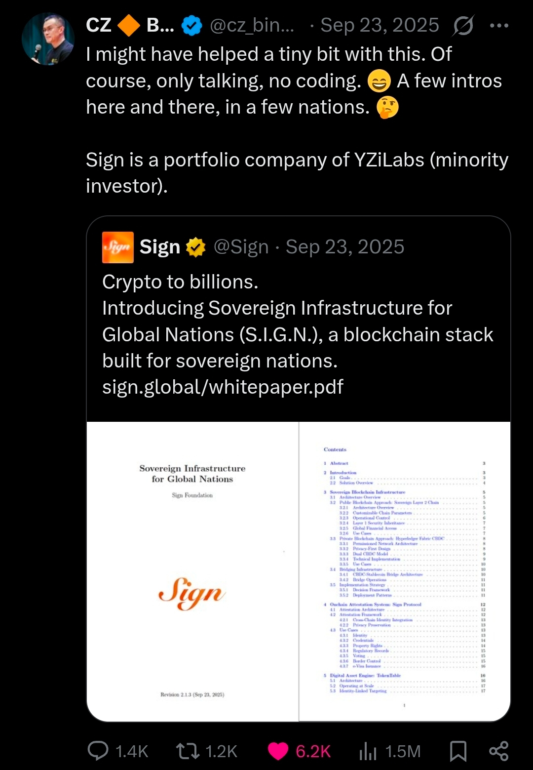 Revelația că Sign este o companie din portofoliul lui CZ de la YZiLabs întărește și mai mult acest suport. Metricile de angajament masive (1.5M vizualizări și mii de interacțiuni) subliniază impactul acestei susțineri, catapultând instantaneu protocolul din obscuritate în centrul conversației din industrie ca un concurent legitim pentru soluții de grad instituțional.