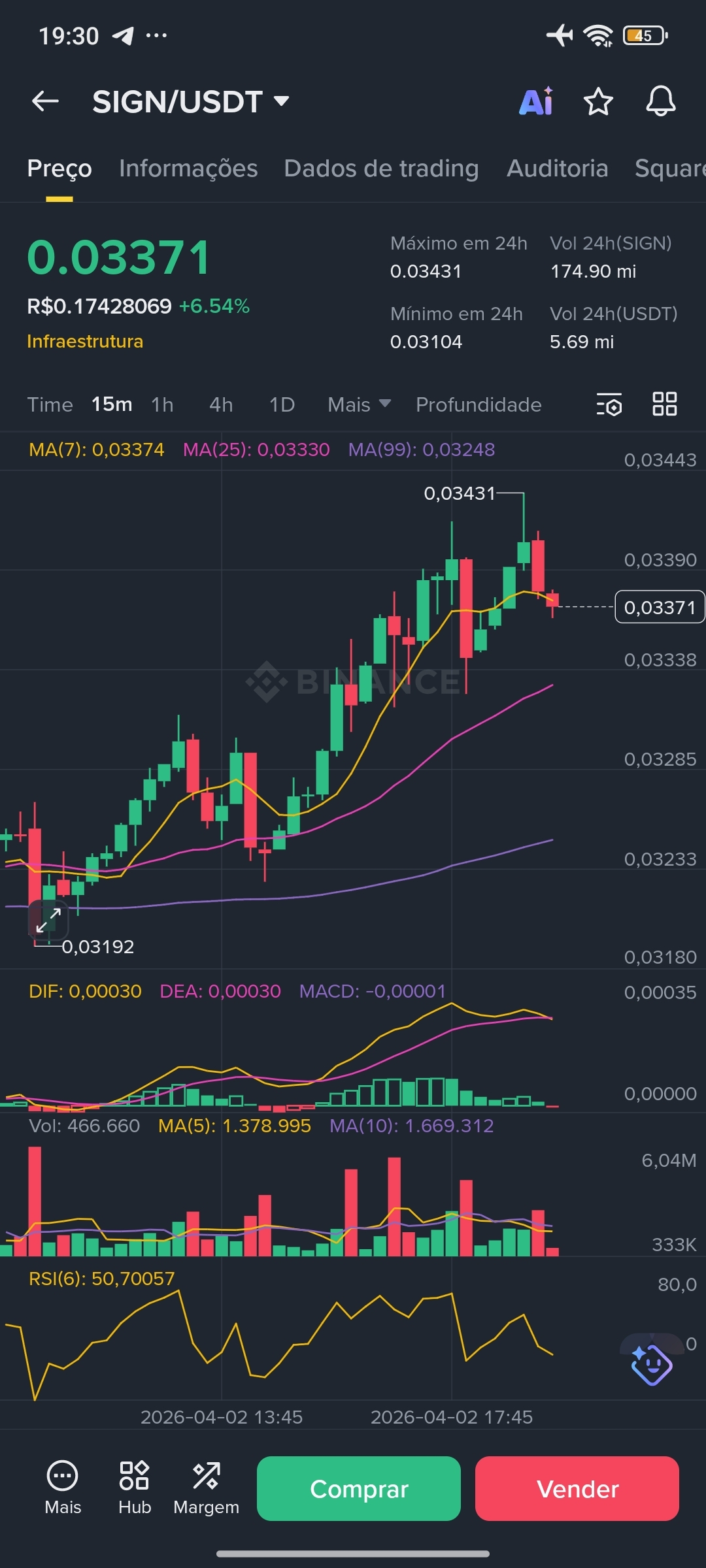 Hoje o $SIGN opera em $0,03371, acumulando +6,54% nas últimas 24h após tocar máxima de $0,03431. O candle de 15 minutos mostra preço colado na MA(7), com MACD praticamente zerado — sinal claro de que o mercado está respirando após o impulso. RSI em 50,7: nem esgotado, nem com combustível novo ainda.