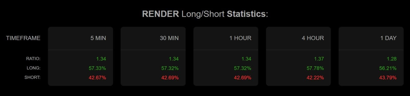 过去八小时内,约有 900万美元流入 RENDER 的期货市场,多头力量明显增强。数据显示,多空比率升至 1.28,多头头寸占总头寸 56%,空头仅占 43%。这意味着大多数参与者看涨,市场情绪积极。