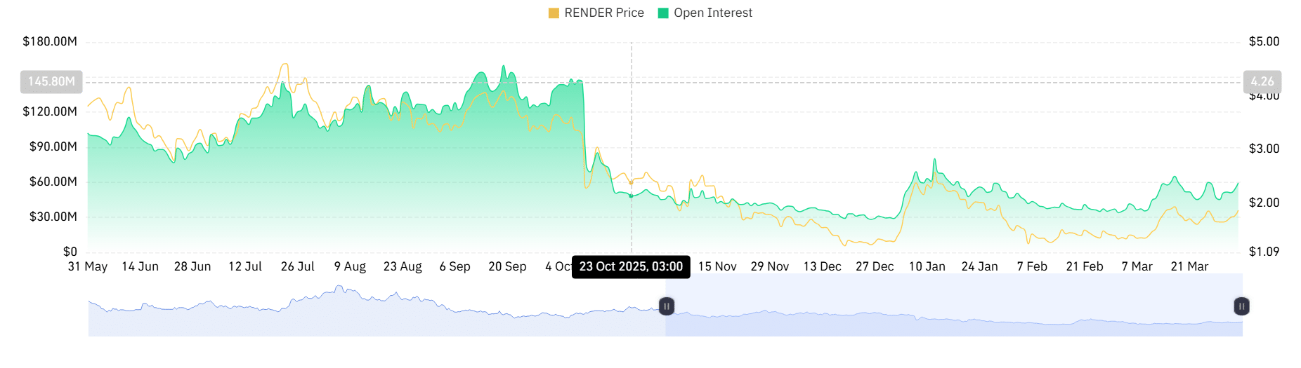 尽管整体市场流动性下降,#render 却表现出极强的上涨动能。尤其在衍生品市场,RENDER 的期货合约需求持续旺盛。根据 CoinGlass 数据,未平仓合约额增加 21%,达到 6000 万美元;期货交易量更是上涨 35%,突破 1.28 亿美元。