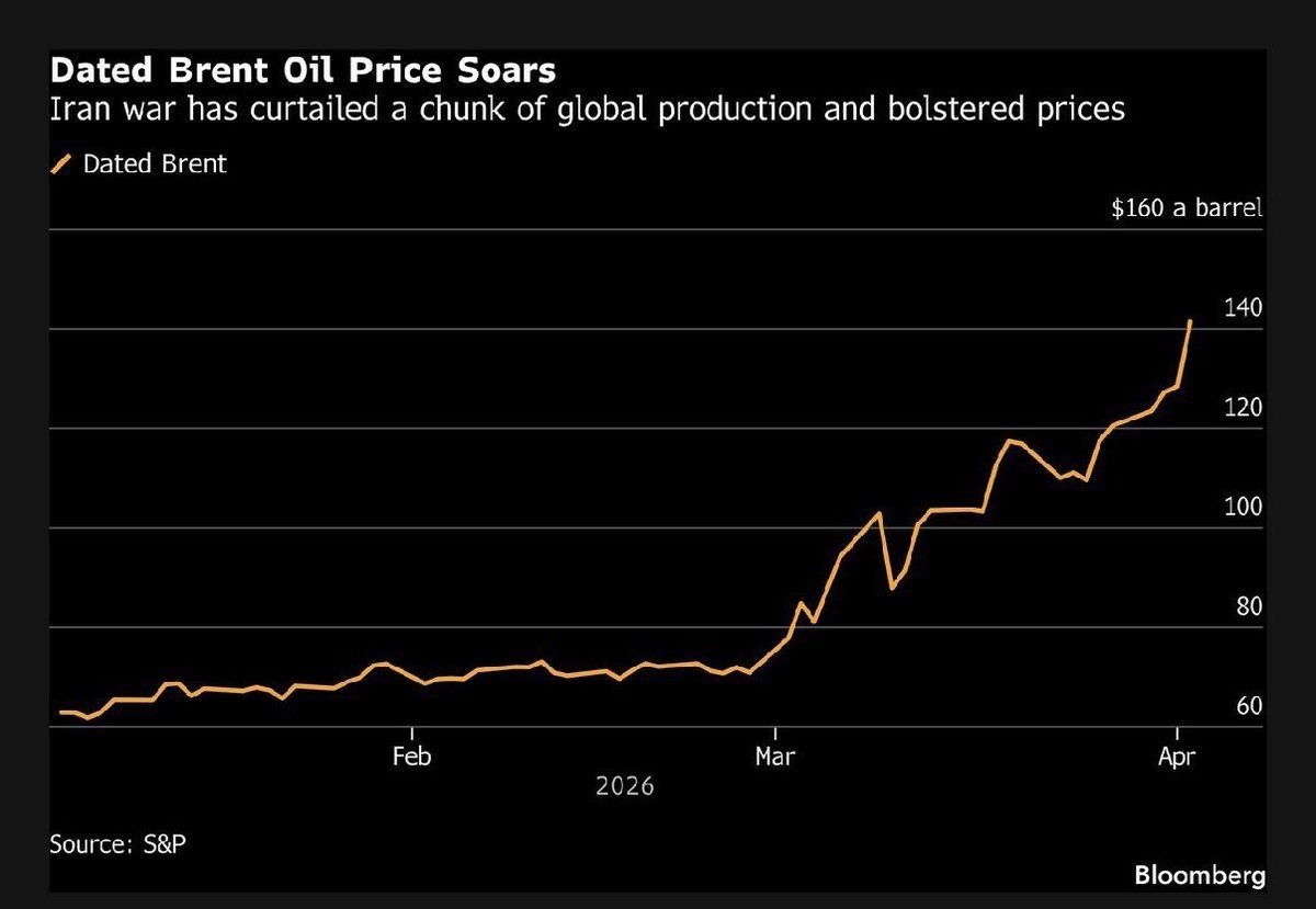 Dated Brent crude has surged to $141/barrel, its highest level since the 2008 Financial Crisis. This reflects physical oil prices, not futures — making the situation more serious.