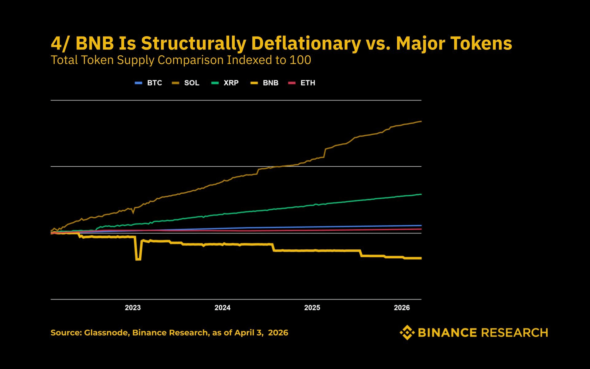 4. BNB is structurally deflationary, aiming for a 50% reduction in supply, from 200 million to 100 million, currently at 136.35 million, driven by a dual burn that combines automatic burning and real-time gas rate burning (BEP-95). This sustained supply contraction contrasts sharply with the persistent inflation observed in most major tokens.