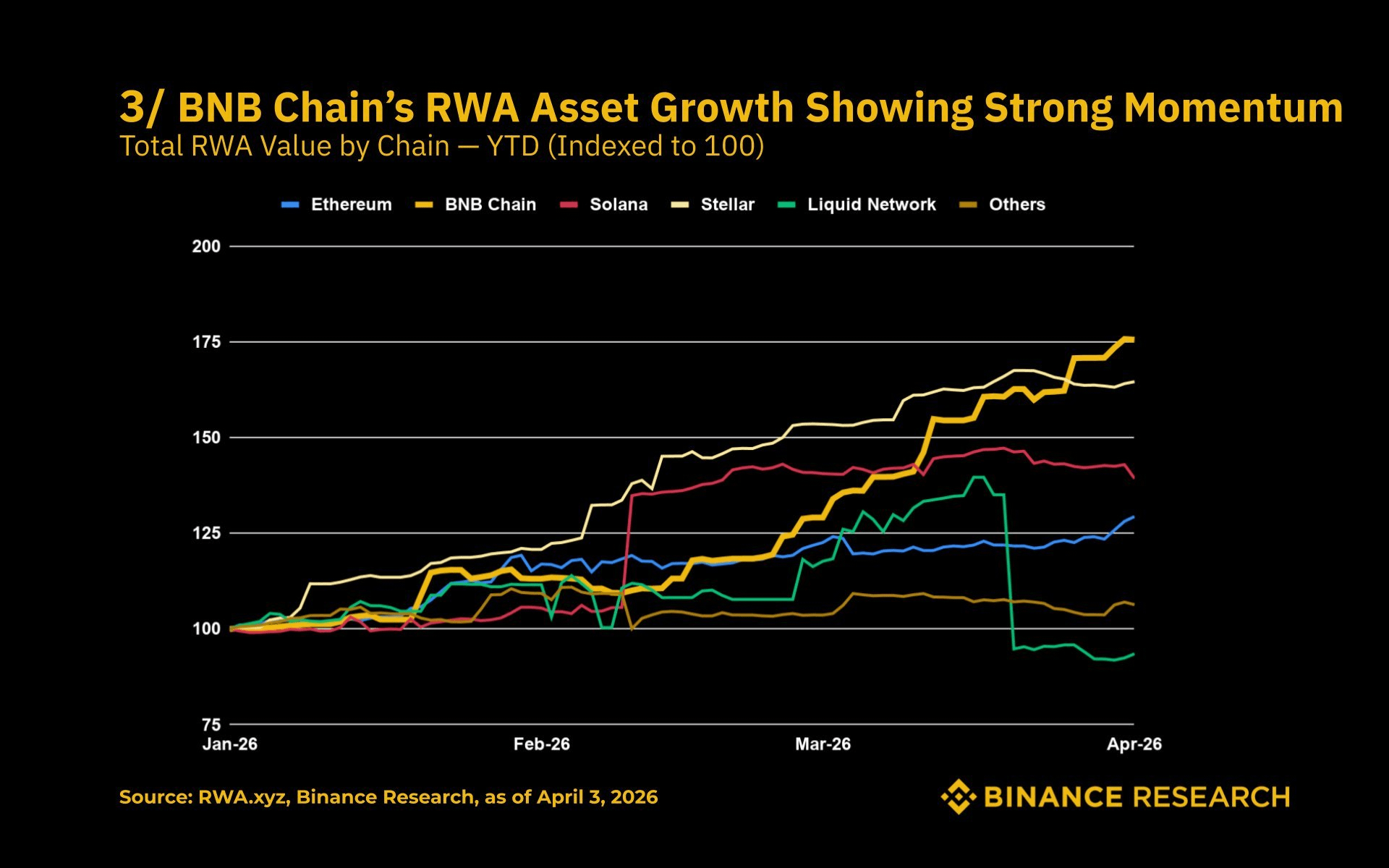 3. The total value of RWA on the BNB Chain reached approximately US$ 3.5 billion, adding about US$ 1 billion in March alone, with tokenized treasuries representing approximately US$ 3 billion, led by USYC (approximately US$ 2.5 billion) and BUIDL (approximately US $500 million).