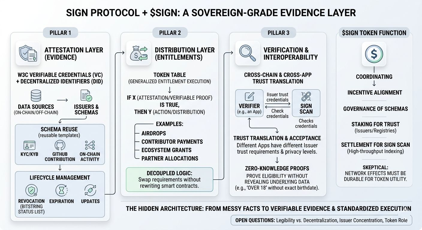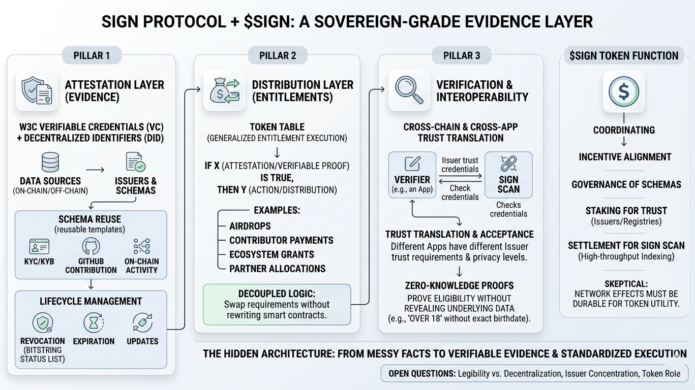 Citind prin documentația ușoară a SIGN și unele dintre documentele live despre atestări / distribuția de tokenuri, în principal pentru că tot vedeam oameni descriindu-l într-un mod foarte comprimat: „verificarea acreditivelor pentru web3” sau „infrastructura de airdrop.” Care, pentru a fi corect, este povestea de suprafață. Un protocol emite atestări, utilizatorii dovedesc că se califică pentru ceva, apoi un sistem de distribuție gestionează reclamația. Destul de ușor de înțeles, destul de ușor de ignorat.