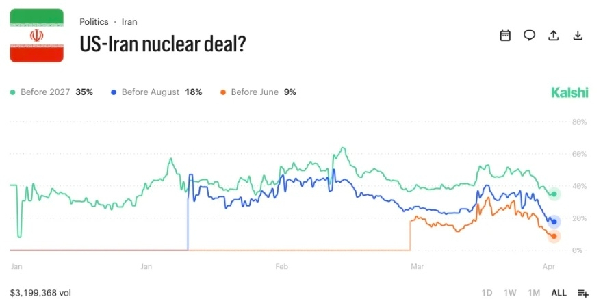 कलशी में परमाणु समझौते का सवाल सबसे अधिक डॉलर की मात्रा आकर्षित करता है। चार बाजारों में व्यापारियों ने यूएस-ईरान परमाणु समझौते के परिणामों में $3.16 मिलियन लगाए हैं। 2027 से पहले एक सौदे में 2.73x पर 35% संभावनाएं हैं। अगस्त से पहले एक सौदा 4.98x पर 19% तक गिर जाता है। पॉलीमार्केट 30 अप्रैल तक परमाणु समझौते को सिर्फ 3% पर रखता है।