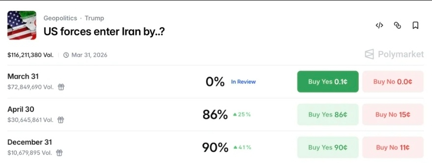 पॉलीमार्केट और कलशी पर प्रेडिक्शन मार्केट ट्रेडर्स ने 2026 के ईरान युद्ध के नतीजे पर बहुत बड़ा करोड़ों डॉलर का दांव लगाया है जिसमें ईरान में U.S. की एंट्री के अब 90% ऑड्स हैं और ट्रेडिंग वॉल्यूम $115 मिलियन से ज़्यादा है।