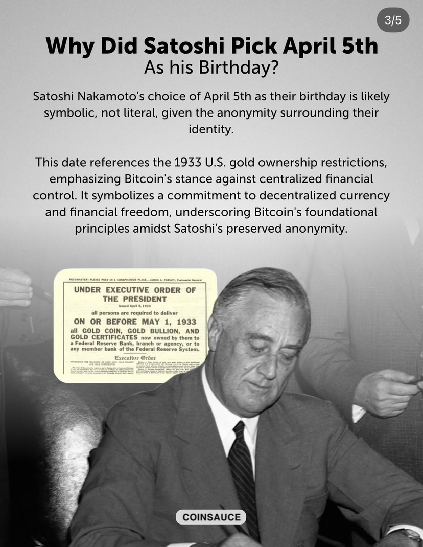 Today marks the symbolic birthday of Satoshi Nakamoto, chosen as April 5th, likely reflecting more than just a date. This selection hints at a statement against centralized financial control, referencing the 1933 restrictions on U.S. gold ownership.