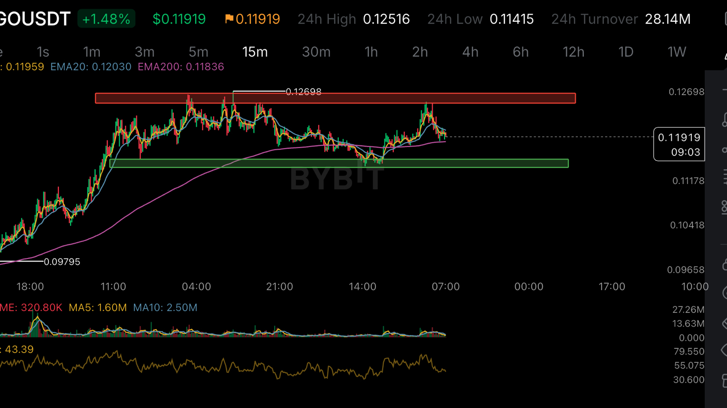 • EMA Analysis: The price is hovering right around the EMA 200 ($0.1183). Staying above this level is crucial for bullish momentum.