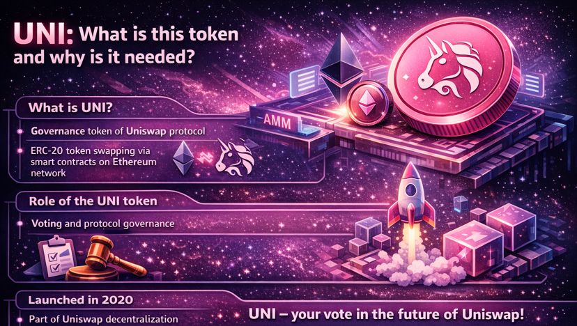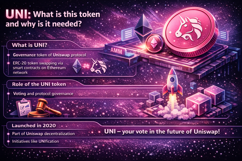 UNI — це нативний токен управління протоколу Uniswap, одного з найвідоміших децентралізованих криптообмінників. Сам Uniswap працює як AMM-протокол, тобто дозволяє обмінювати ERC-20 токени без класичної біржової книги ордерів, напряму через смартконтракти в мережі Ethereum.