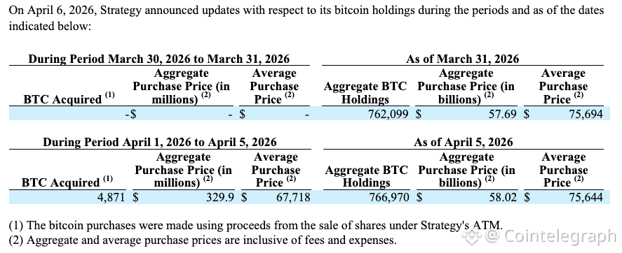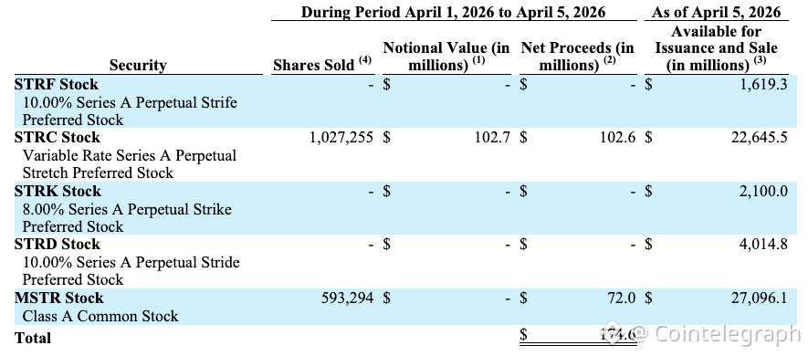 During March 30–31, Strategy sold approximately 2.28 million shares of STRC and 582,550 shares of MSTR, generating about $299.3 million in net proceeds. From April 1–5, the company sold an additional 1 million shares of STRC and 593,294 shares of MSTR, raising roughly $174.6 million.