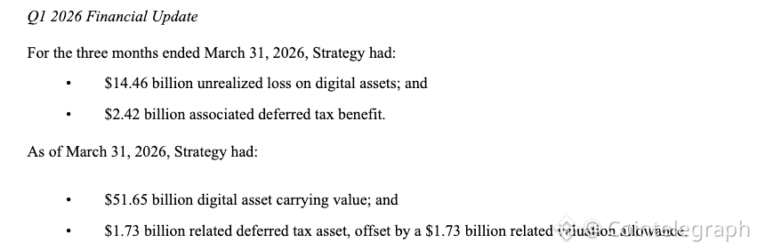 In addition to the purchase update, Strategy also reported its first-quarter financial results, including a $14.46 billion unrealized loss on digital assets and a $2.42 billion deferred tax benefit.