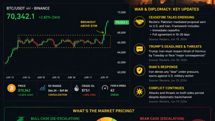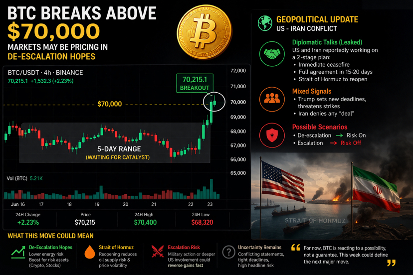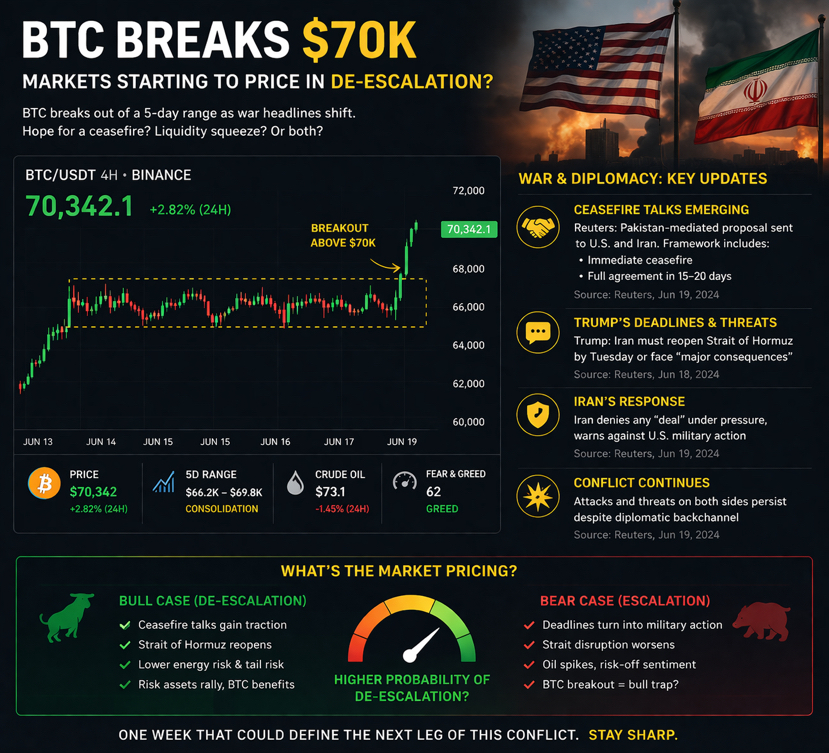 BTC moving back above $70K matters because it finally broke out of the range it had been stuck in for almost five days, a range defined by hesitation, headline risk, and pure uncertainty. The hard part is that the move is still open to interpretation. It could be a relief bid on hopes that the conflict is approaching some kind of pause. It could be positioning around fears that the worst escalation may be avoided. Or it could simply be a liquidity-driven squeeze in a market that had become too compressed. Reuters reported today that a Pakistan-mediated proposal has been shared with both Washington and Tehran, with one framework describing an immediate ceasefire and broader talks within 15 to 20 days, though Tehran has not committed to it.