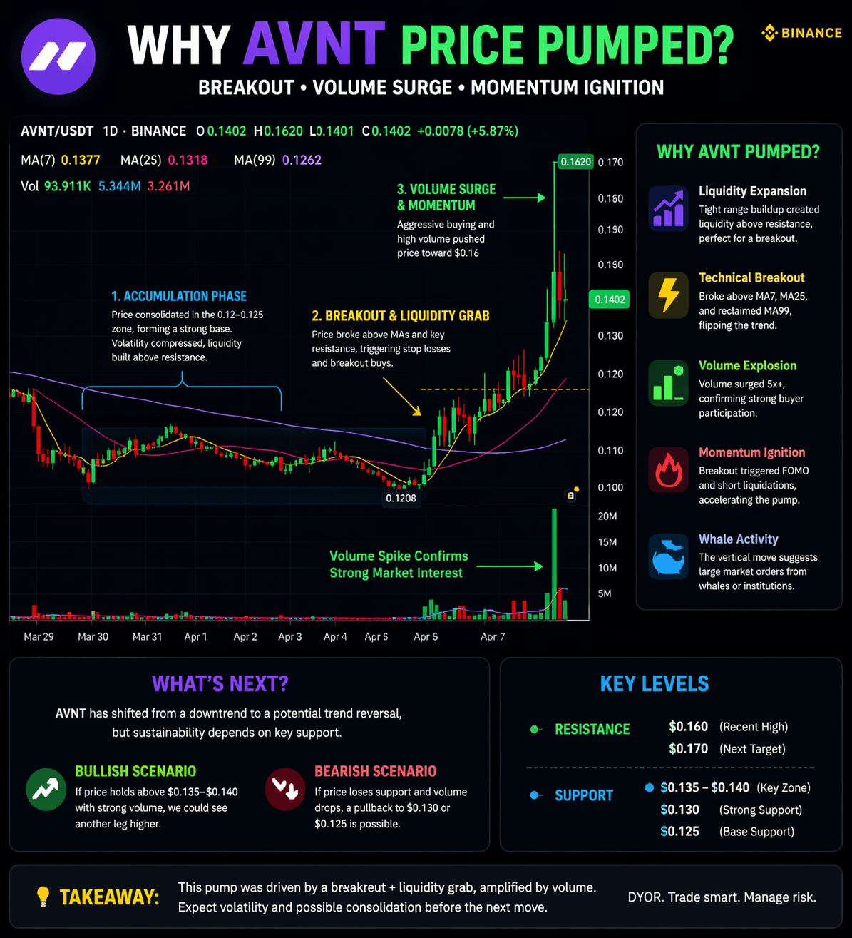 From a structure standpoint, AVNT has now shifted from a downtrend into a potential trend reversal phase, but sustainability depends on whether price can hold above the 0.135–0.14 support zone. The sharp increase in volume confirms genuine interest, but such parabolic moves often lead to short-term pullbacks or consolidation before continuation. If volume dries up and price loses short-term support, a retrace toward the 0.13 zone is likely; however, if buyers defend this region and volume remains elevated, AVNT could attempt another leg higher. In summary, this pump is technically driven by a breakout + liquidity grab, amplified by volume expansion, but traders should remain cautious of volatility spikes and potential cooldown phases before any sustained uptrend continuation.