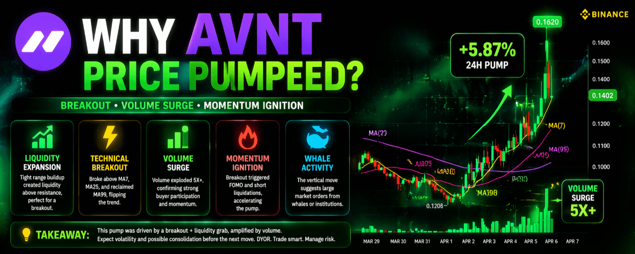 The recent pump in #AVNTUSDT appears to be a classic combination of liquidity expansion, technical breakout, and momentum ignition. After a prolonged period of sideways consolidation and lower highs, price built a base around the 0.12–0.125 region, which acted as a strong accumulation zone. This range compression reduced volatility and created a liquidity pocket above resistance. Once buyers stepped in with strong volume (visible from the sharp spike in trading activity), price broke above short-term moving averages (MA7 and MA25) and reclaimed the mid-term trend (MA99), triggering a cascade of breakout buys and short liquidations. The vertical move toward ~0.16 suggests aggressive market orders rather than gradual accumulation, indicating that this pump was likely fueled by whales or coordinated momentum traders, not just retail participation. The long upper wick near the top also signals initial profit-taking and possible resistance.