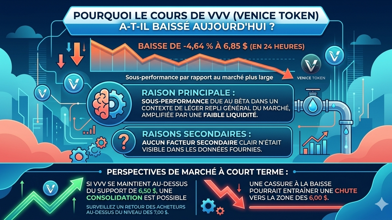 Le Venice Token a baissé de 4,64 % pour atteindre 6,85 $ en 24 heures, affichant une performance inférieure à celle d'un marché plus large légèrement plus faible, principalement en raison d'un manque d'intérêt pour l'achat dans un environnement de faible liquidité.