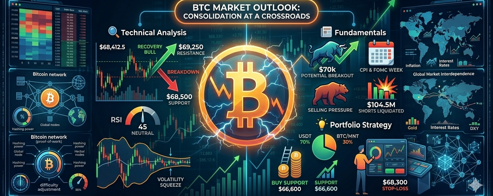Bitcoin ($BTC ) is currently holding in a consolidation phase with a short-term bearish tilt, trading at $68,412.5 USD (-1.94% in the last 24h). Here is a technical and fundamental breakdown to guide your strategy: