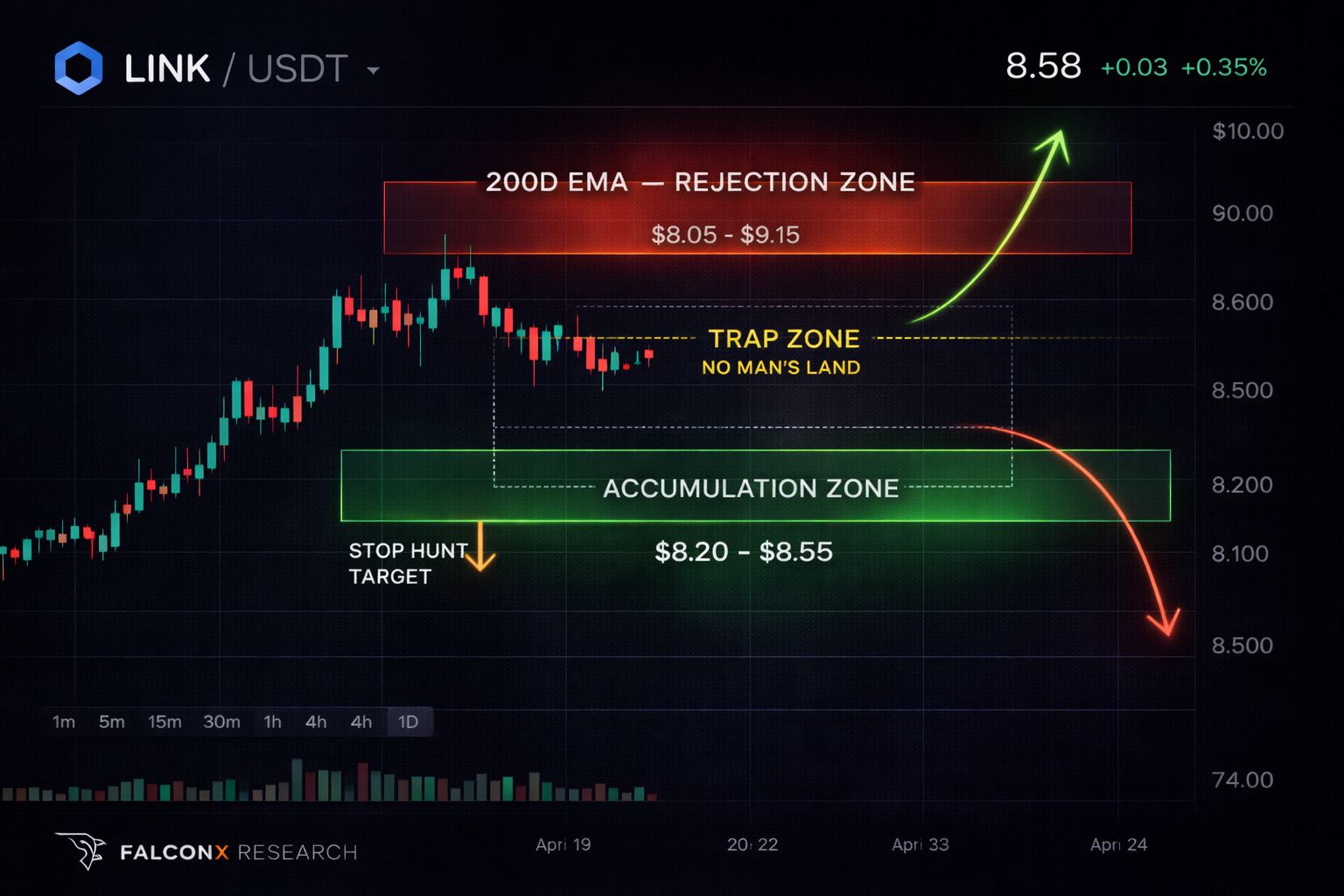 EMA de 200 de zile se află la $9.05–$9.15 — respingerile repetate aici confirmă că vânzătorii sunt încă în control pe termen scurt. (Coin Edition) Lichiditatea se află sub $8.20. Acea zonă nu a fost încă înlăturată.