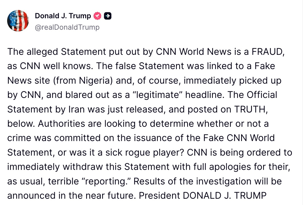CNN is being ordered to immediately withdraw this Statement with full apologies for their, as usual, terrible “reporting.”