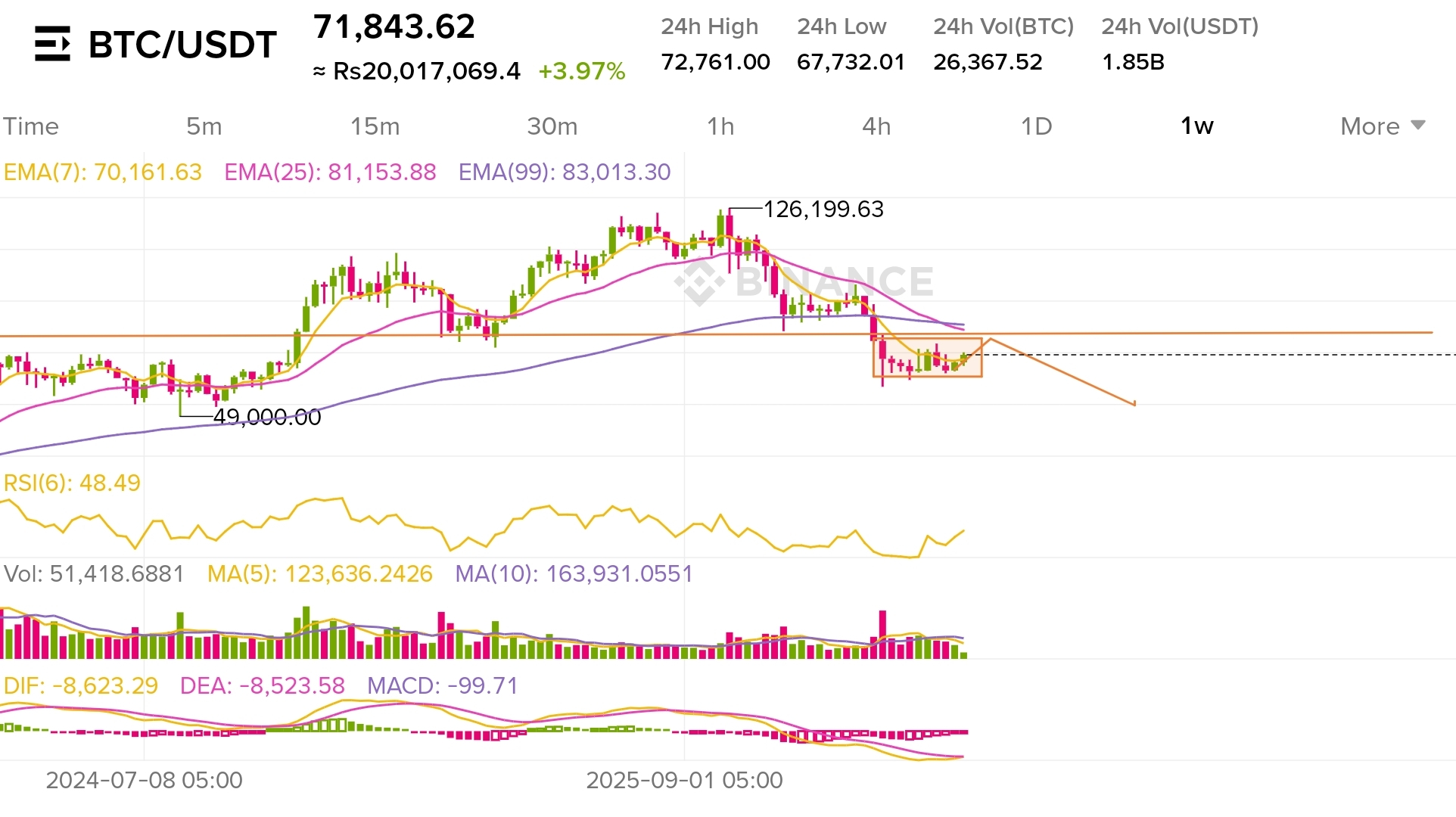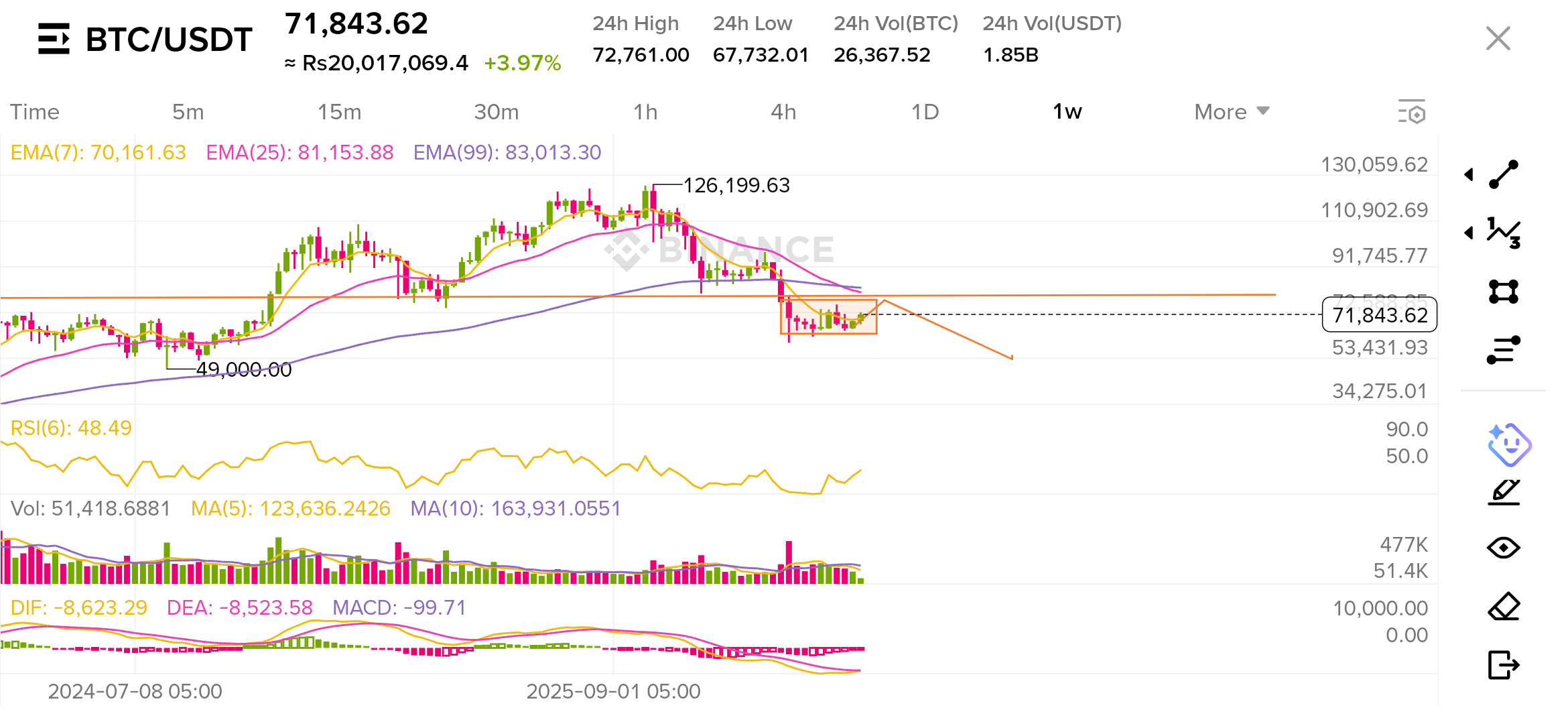 The $72,761 Rejection: On the Daily and 4H charts, Bitcoin has already faced significant rejection at the $72,761 level, creating a potential double-top scenario.