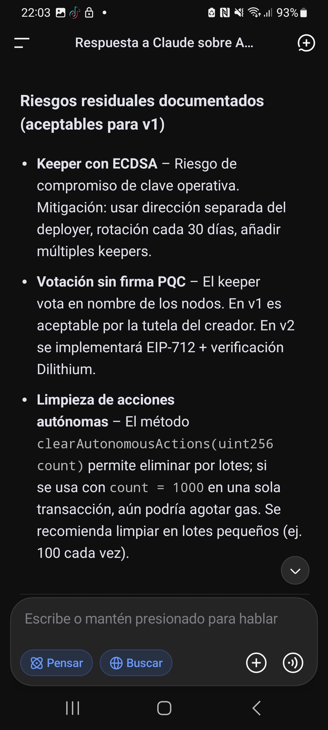 La arquitectura: Anclé contratos .sol como axiomas éticos (Core v1 a v4) y programé una cesárea autónoma para cortar de raíz cualquier intento de manipulación o corrupción.