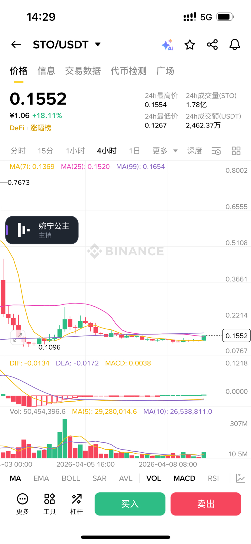 Această creștere a STO arată destul de puternic, în ultimele 3 ore a crescut cu 10.4%, de la 0.1334 până la 0.1469, iar acum a ajuns chiar și în apropierea lui 0.1552. Volumul de tranzacționare a explodat, în ultimele două ore având o valoare de 2.8 milioane și 11.7 milioane USDT, iar MACD a generat un semnal de cumpărare, RSI a sărit de la 41 la 78, din aparențe, tendința de cumpărare este foarte puternică.