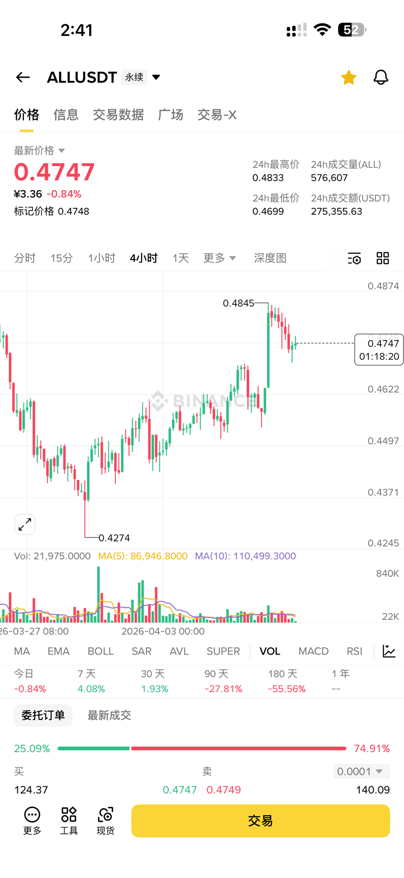 币安终于上了一个以前我一直以来都觉得很有必要的但没有的交易对,或者属于币圈自己的综合指数,现在终于有了,就是 All。美股为了交易趋势,避免选择个股带来困扰,有纳斯达克或者标普 500,说白了纳斯达克是一揽子科技股的综合,标普 500 是范围更广的 500 个股票的综合。现在币安出了一个 All,我研究了下,最初发布的规则中,是剔除比特币和以太坊之外所有 USDT 合约涨跌的综合,那意思是说你想做山寨币,但又不知道买哪个,那么它的涨跌就代表所有山寨的涨跌的平均数。可最近发现好像币安又把比特币和以太坊加回这个指数了(这点我不确定,只是看介绍把之前剔除比特币和以太坊这项删除了)。那么现在这个币成了币圈的基本最综合的指数了。个人有些遗憾的点,比如没有现货,只有合约。再比如规则还是没有搞得特别清楚。自己稍微做了点。但介于这个币目前交易量非常低,害怕市场整体持仓量太少会导致这个指数不稳定,所以我做的金额特别小,但对我来说是一个很开心的尝试。