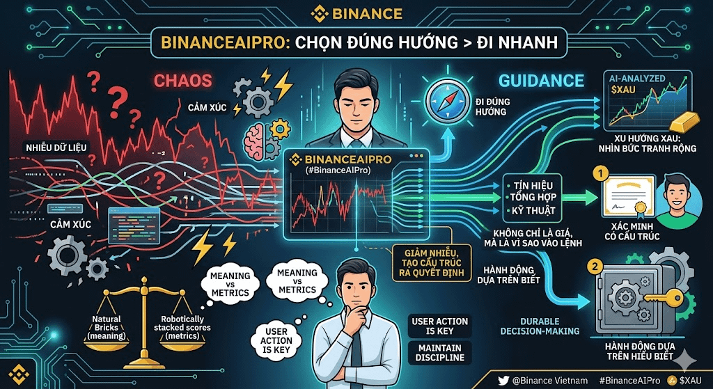 Đó là lúc mình bắt đầu nhìn #BinanceAIPro theo một góc khác. Không phải như một công cụ dự đoán thị trường, mà giống một lớp giúp sắp xếp lại sự hỗn loạn. Khi theo dõi $XAU , thay vì chỉ phản ứng theo những nhịp tăng giảm ngắn hạn, mình có thể nhìn vào một bức tranh rộng hơn: xu hướng tổng thể, các tín hiệu kỹ thuật được tổng hợp, và cách thị trường đang phản ứng với những yếu tố lớn hơn như kinh tế vĩ mô hay tâm lý dòng tiền.