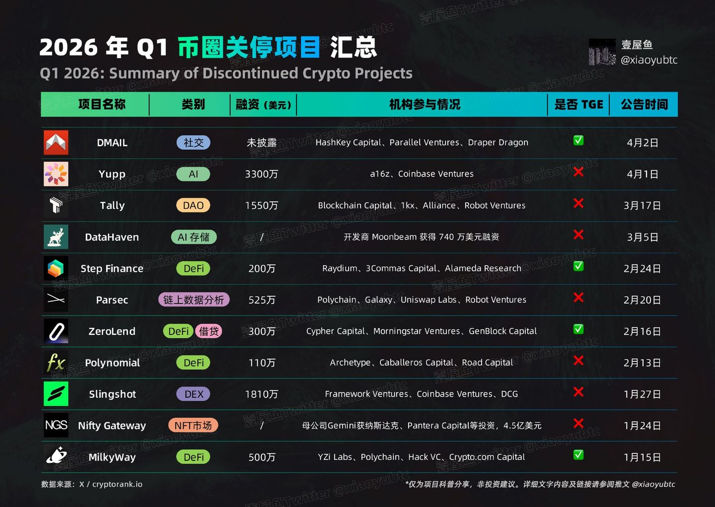 2026年一季度,币圈寒冬清退潮来得猝不及防且异常残酷,截至3月底,已有超21个加密项目接连官宣停摆、转型或破产清算。这份冰冷的名单,彻底撕碎了“融资即上岸”的幻想,也让所有人看清核心真相——熊市的洗牌,从来不会手下留情,无论项目曾经多风光,扛不住压力终将被淘汰。