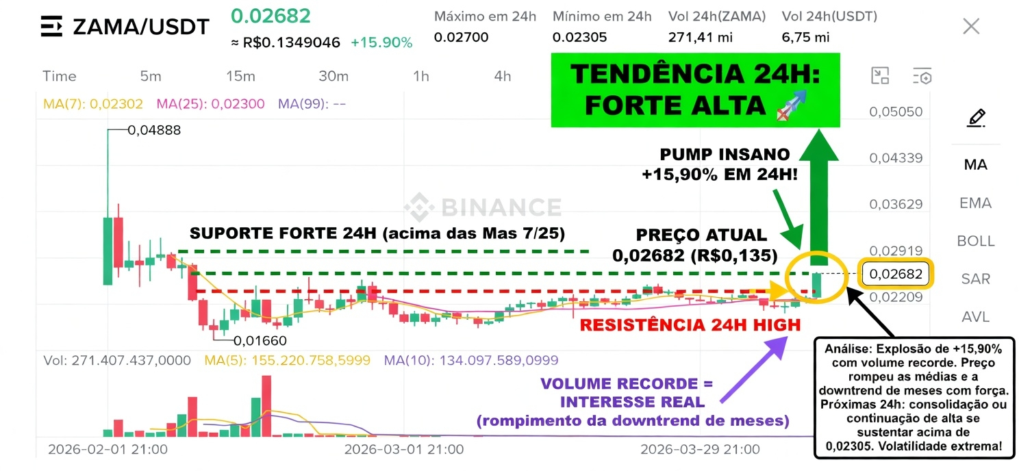 - Ação explosiva recente: após meses de queda e lateralização, ZAMA deu um breakout vertical com volume recorde, saindo da base ~0,023 e disparando até tocar 0,02700.
