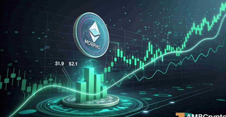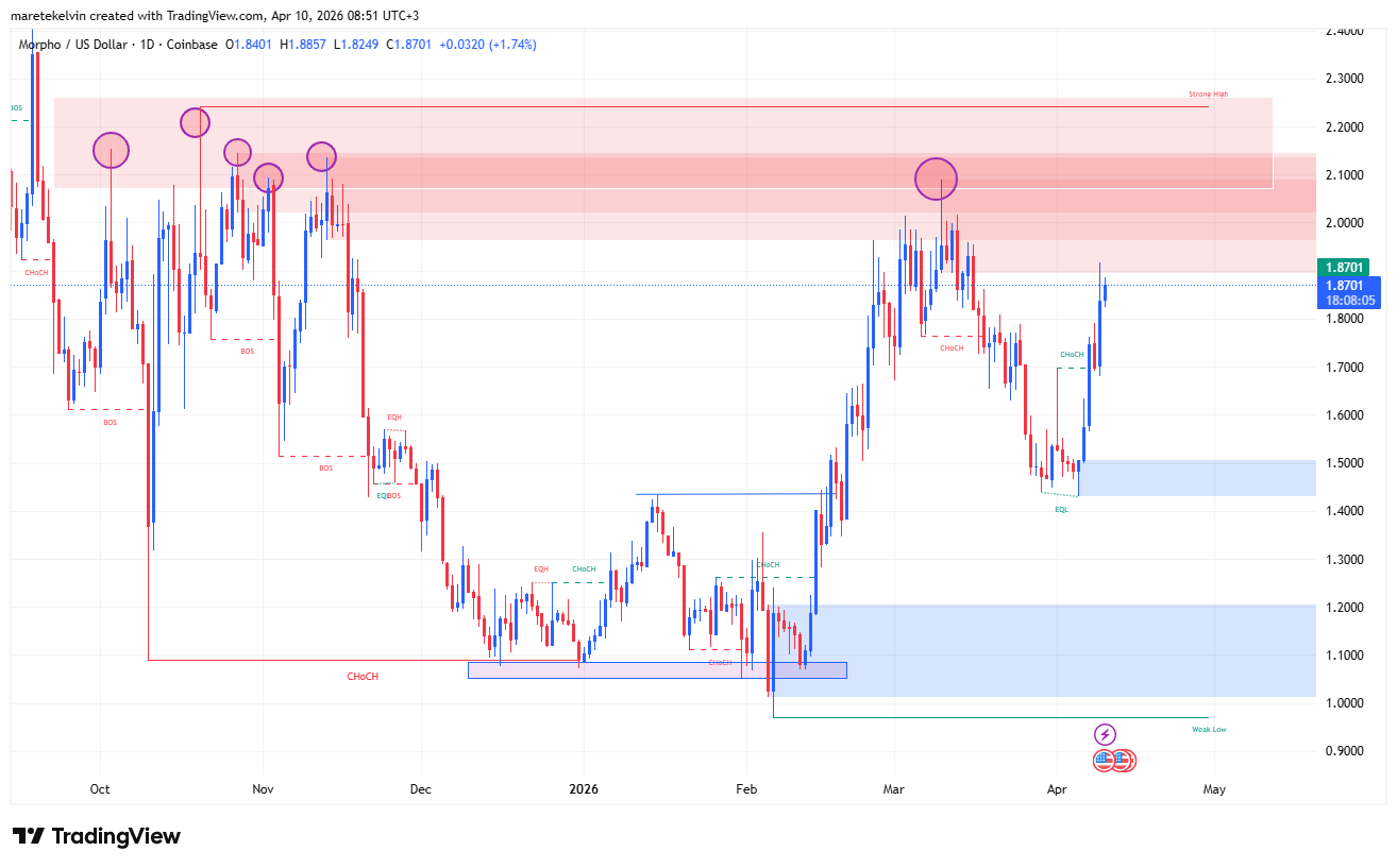 从日线结构来看,MORPHO正在逼近一个非常关键的区间——1.9美元到2.1美元。这一带可以理解为“压力区”,此前价格多次在这里受阻回落,是典型的供应密集区域。