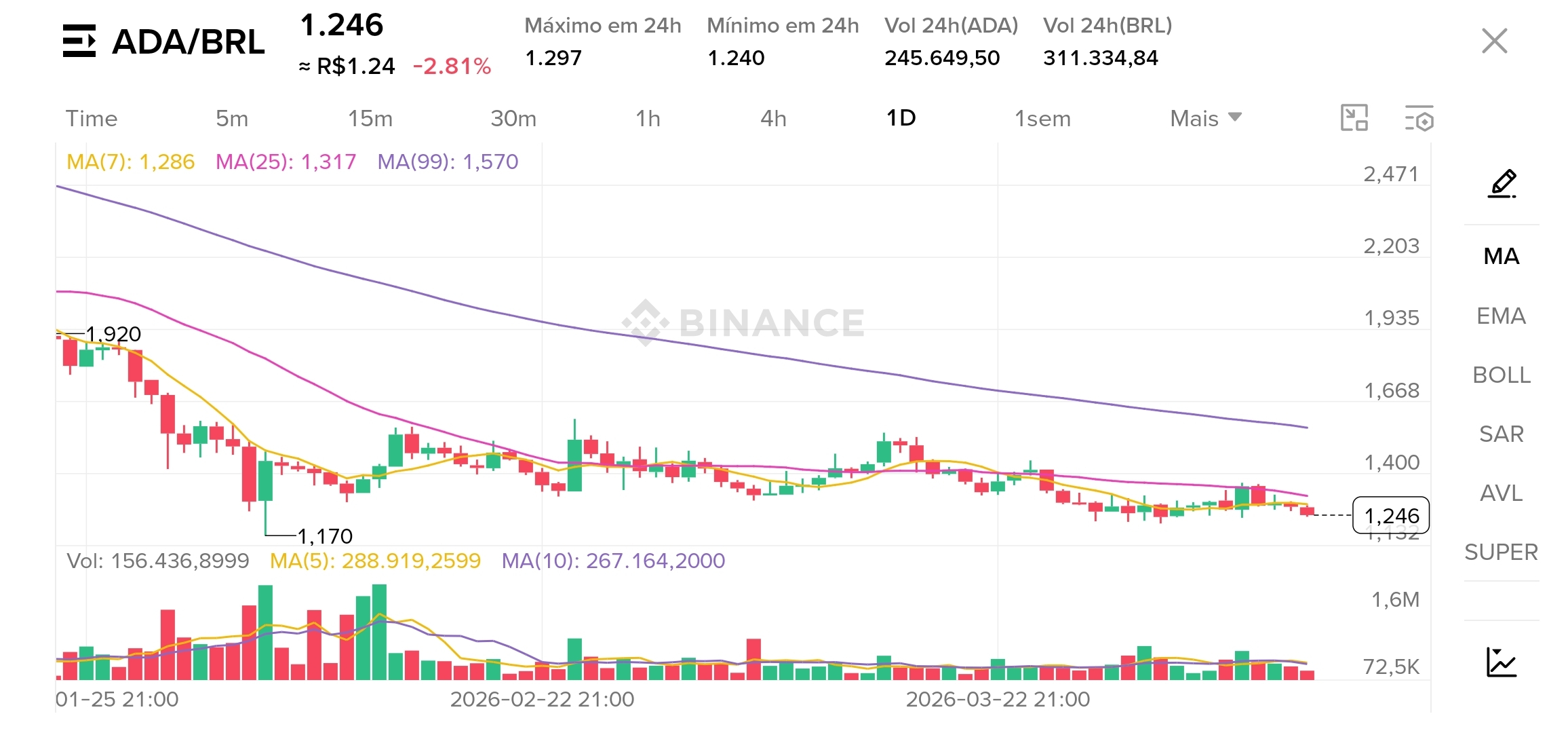 Com base na análise técnica do gráfico de ADA/BRL, o ativo está em uma tendência de baixa, operando abaixo das principais médias móveis.