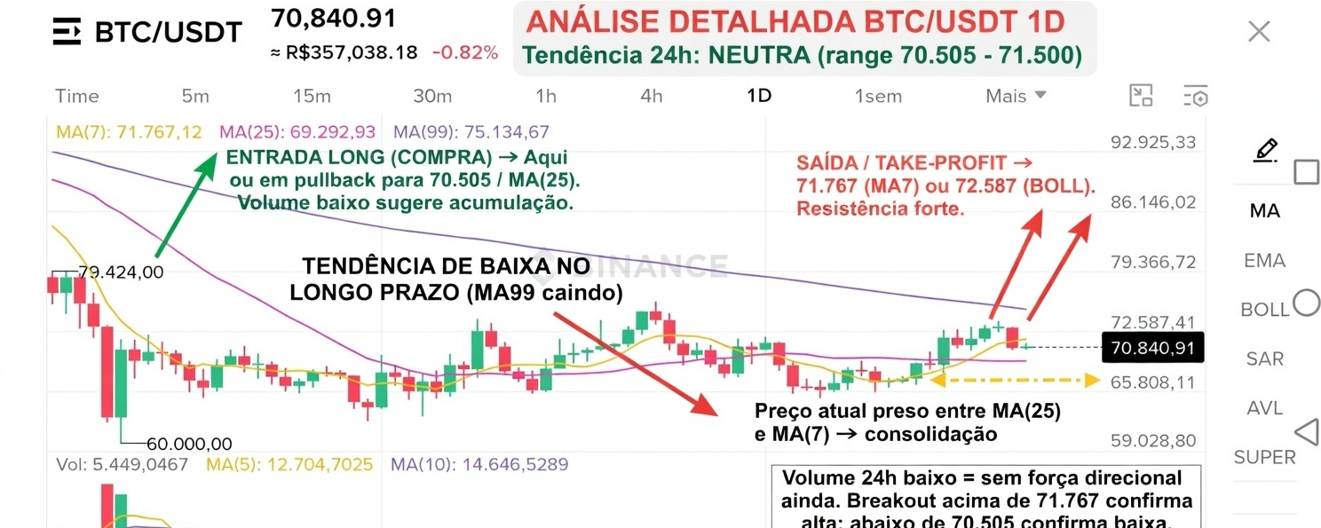 O preço oscilou entre 70.505 (mínimo 24h) e 71.500 (máximo 24h). Não houve rompimento decisivo de nenhuma média importante nem do Bollinger. Estamos dentro de um range clássico de acumulação. Sem volume forte, dificilmente teremos movimento explosivo hoje — o mais provável é continuar oscilando dentro dessa faixa.