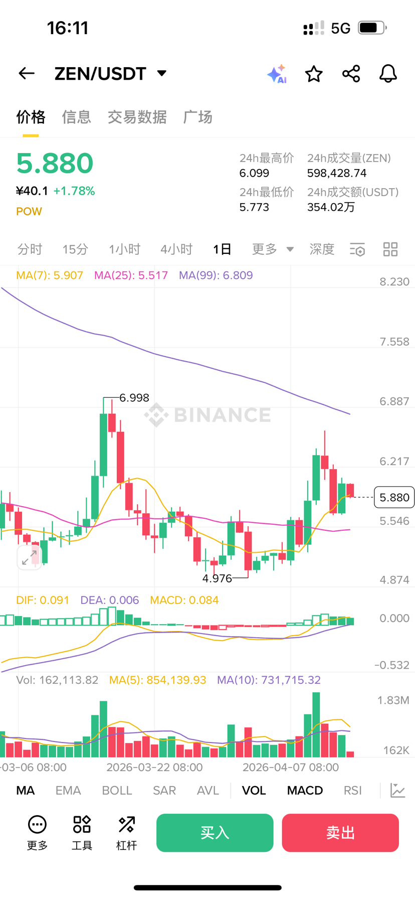 Primul lucru este să arunc o privire asupra pieței, prețul se află acum în jurul valorii de 5.88, în ultimele 24 de ore a atins un maxim de 6.099 și un minim de 5.773, în general a crescut cu aproape două puncte, ceea ce nu este foarte mult, dar volumul de jos este destul de interesant. MACD tocmai a trecut de axa zero, DIF și DEA se mișcă foarte aproape, coloanele roșii nu s-au mărit, dar nici nu s-au micșorat, ceea ce arată că energia este încă acolo, doar că acum ia o pauză. În sistemul mediei mobile pe termen de o oră, MA7 este la 5.907, MA25 este la 5.517, media mobilă pe termen scurt a trecut deja peste media mobilă pe termen mediu, prețul se apropie de linia pe termen scurt, iar această structură arată destul de confortabil.