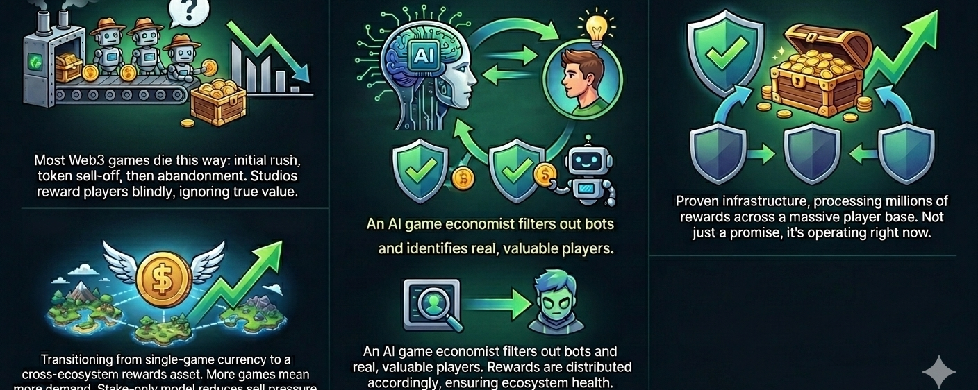 Game studios want players to stick around. But most rewards systems are blind — they hand out tokens whether a player is valuable or just farming. Stacked changes this with an AI game economist that watches player behavior in real time. It learns who actually adds value, then rewards them accordingly. Bots get filtered. Real players get paid.