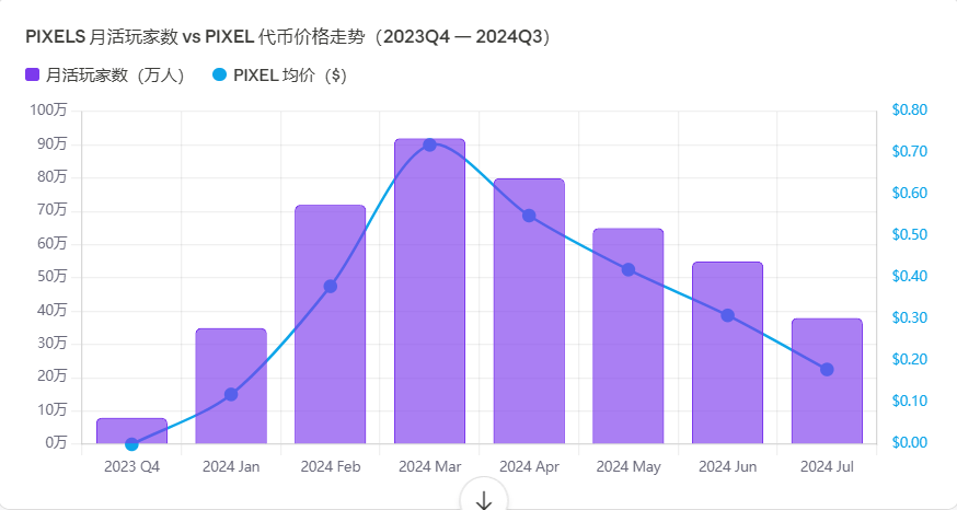 以下图表展示了 PIXELS 游戏自上线以来日活玩家数与 PIXEL 代币价格的联动趋势,揭示出链游项目中用户增长与代币价值之间的强相关性