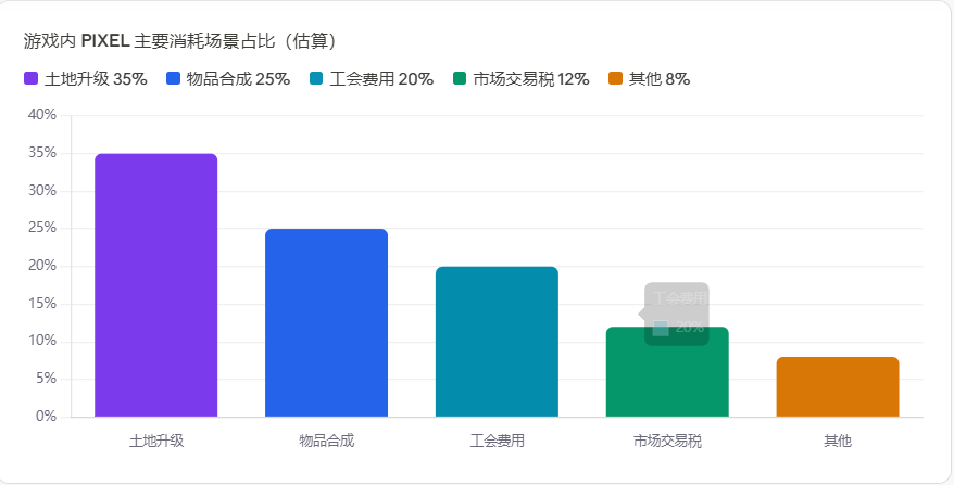 我还分析了代币的收入和消耗机制,PIXELS 在 Sink 机制的设计上颇具创意,玩家在游戏内完成使用土地,参与工会行为,均需消耗 PIXEL 代币,从而持续减少市场流通量