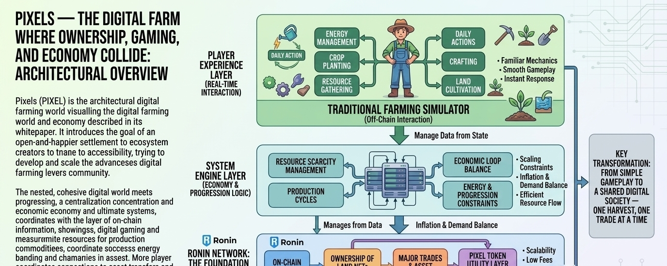 There are moments in internet history when a simple game stops feeling like just a game and starts behaving like a living system and Pixels (PIXEL) is one of those quiet experiments that slowly transforms from a farming simulator into a full scale digital economy running on the Ronin Network where every action planting crops gathering resources crafting items trading goods starts to resemble a reflection of real world economic behavior. It is built not only for entertainment but for interaction ownership and persistence where players are not just users pressing buttons but participants inside a shared digital society that continues evolving even when they log out.