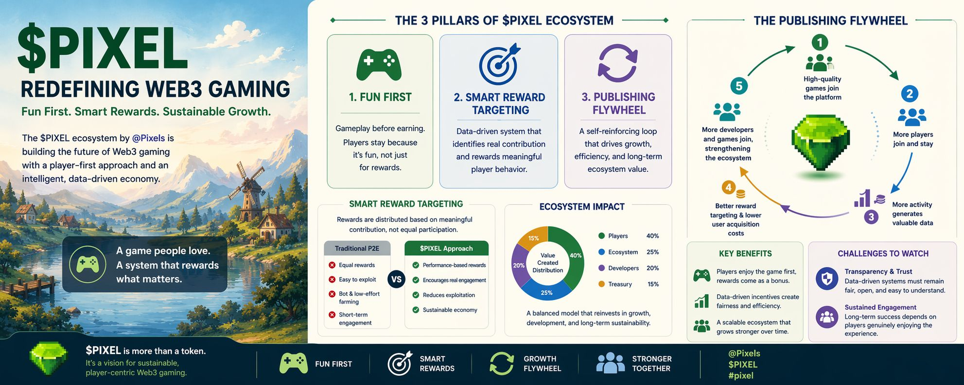 Una dintre cele mai evidente schimbări în acest model este decizia de a prioritiza gameplay-ul în detrimentul profitului. În loc să trateze recompensele ca principalul atracție, Pixels pune accent pe construirea unui joc pe care oamenii să se bucure cu adevărat. Aceasta este o schimbare critică deoarece vizează cauza principală pentru care multe sisteme play-to-earn eșuează. Când utilizatorii sunt motivați doar de stimulente financiare, conexiunea lor cu platforma este temporară. Concentrându-se pe plăcere mai întâi, $PIXEL își propune să construiască o bază de jucători care rămâne activă chiar și atunci când recompensele fluctuează.