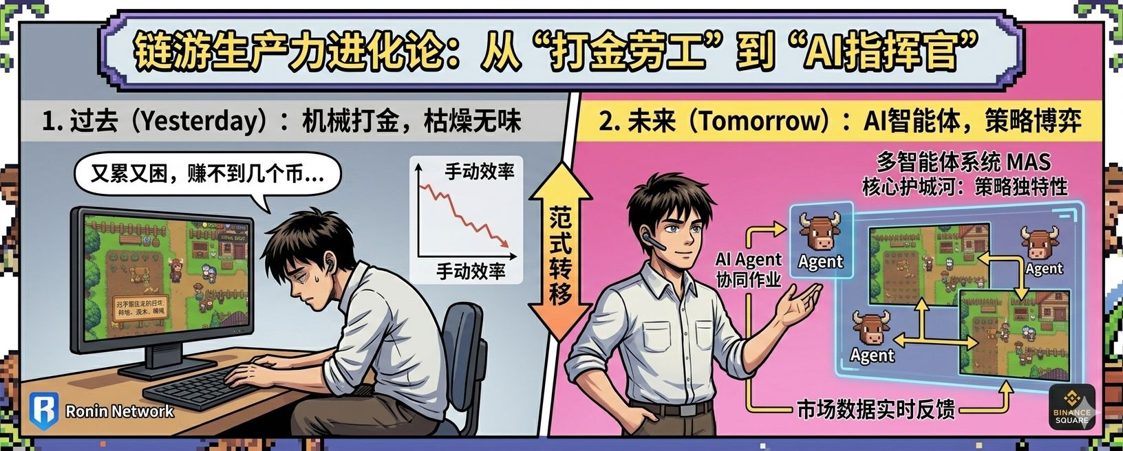 昨天和几个朋友吃饭,聊到了现在大火的OpenClaw,其中一个朋友说现在用它每天能躺赚30多刀,要我好生羡慕。最近我刚好在玩Pixels@Pixels ,但还在靠手动点击,生产力低下,每天要花费很多时间。于是回到家查阅了相关资料,才发现随着AI Agent技术的成熟,链游领域正在经历一场从“人力密集型”向“硅基军团”的范式跃迁。AI Agent不再仅仅是辅助工具,它们正在成为数字农场的新一代核心劳动力。