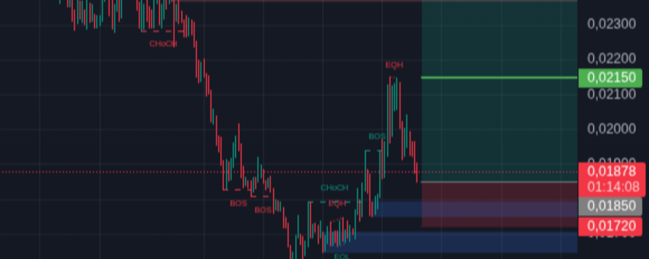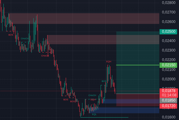 Setup ini menawarkan risk-reward ratio yang cukup menarik. Dari entry 0,0185 ke TP1 0,0215 memberikan potensi gain sekitar 16%, sementara ke TP2 0,025 bisa mencapai hampir 35%.