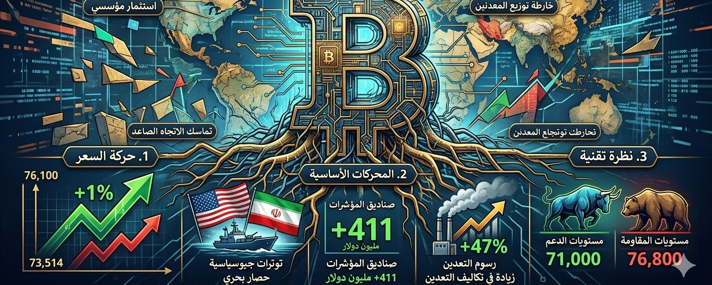 • التوترات الجيوسياسية: تأثرت الأسواق بزيادة حدة التوتر بين الولايات المتحدة وإيران، حيث أدى الإعلان عن "حصار بحري" لمضيق هرمز إلى ضغوط بيع مؤقتة دفعت البيتكوين للتراجع بعد أن لامس مستويات الـ 76 ألفاً