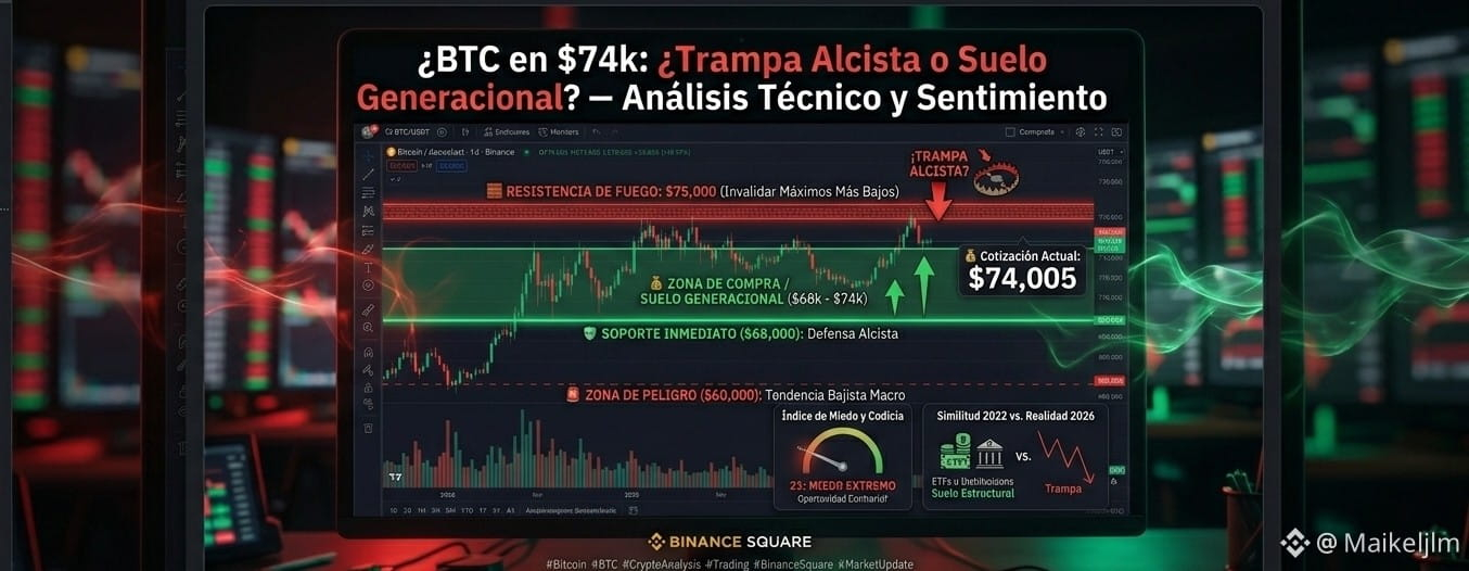 1. Resistencia técnica en los 75,000 USD Este nivel se consolida como el punto psicológico y técnico más relevante del trimestre. Una ruptura confirmada por encima de esta barrera invalidará la estructura de máximos decrecientes observada desde el máximo de 2025 (126k USD), debilitando la tesis de una posible trampa alcista.