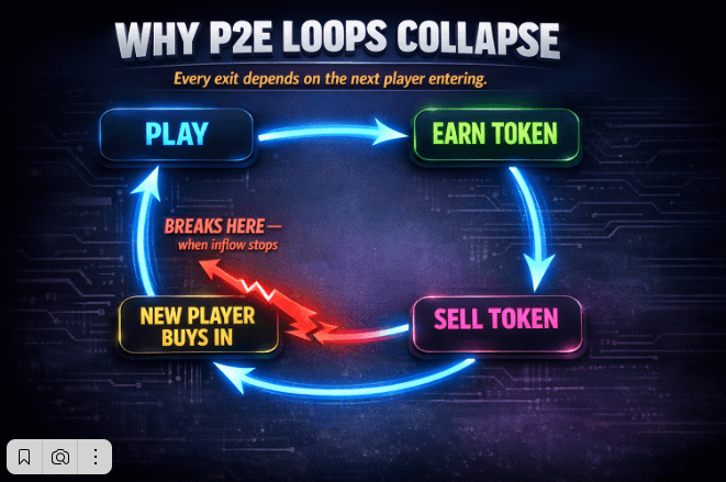 Classic P2E loop: player plays → earns token → sells token → new player buys token to enter. While inflow exceeds outflow, everything holds. But structurally this is a pyramid. Not a fraudulent one — just an unstable one.